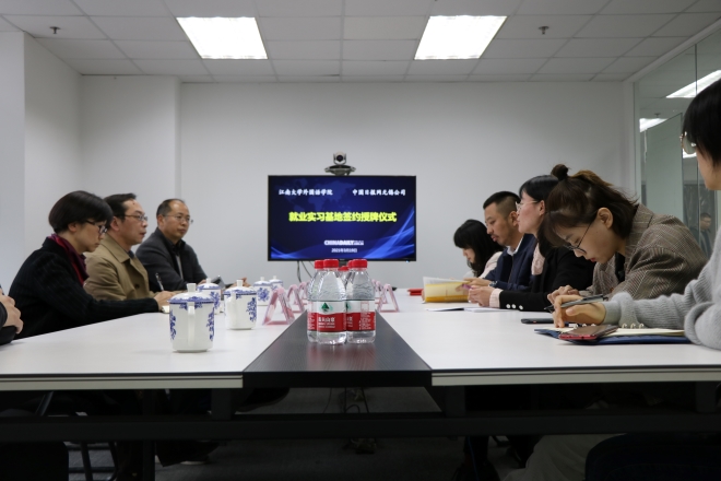 会议最后,双方就就业实习基地的建立意义和人才培养战略进行了深入的探讨并达成一致,双方代表在实习基地协议书上签字,院长方文开代表学院向中国日报网无锡公司代表授予“就业实习基地”铜牌。