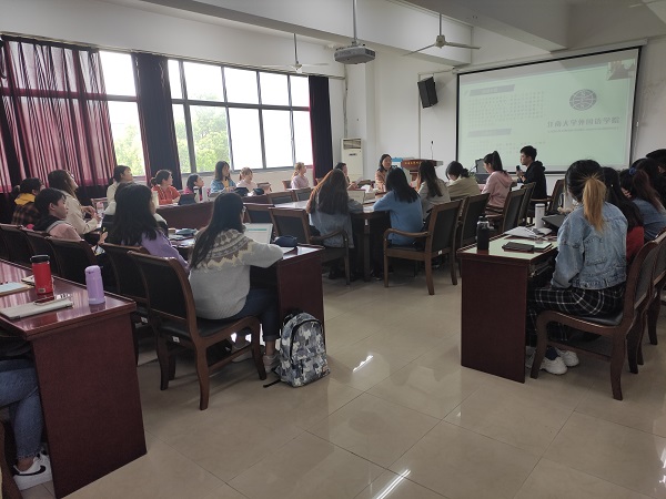 “研途奋进”首期活动在文科楼A349举行,本次活动主题为学术分享,水果派方文开院长、谢竞贤副院长全程观摩了本次活动。2020级全体硕士研究生及于线下参与了本次活动,2018级、2019级全体硕士研究生通过钉钉直播参与了本次活动。部分感兴趣的英语专业大四本科生也闻讯前来现场聆听分享。