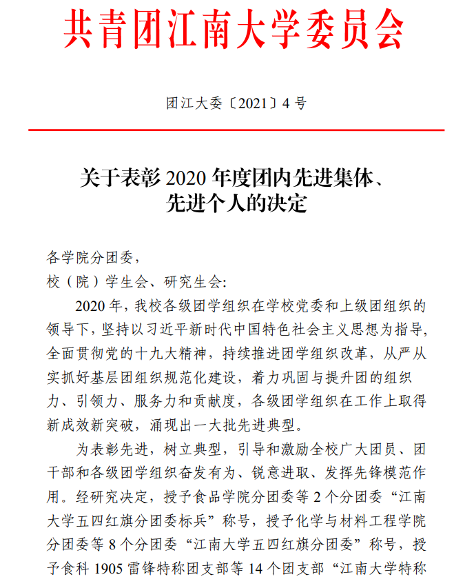 委员会下发《关于表彰2020年度团内先进集体、先进个人的决定》(团江大委〔2021〕4号),对2020年度做出突出贡献和成绩的一批先进集体与个人进行表彰,水果派分团委被评为2020年度“水果派