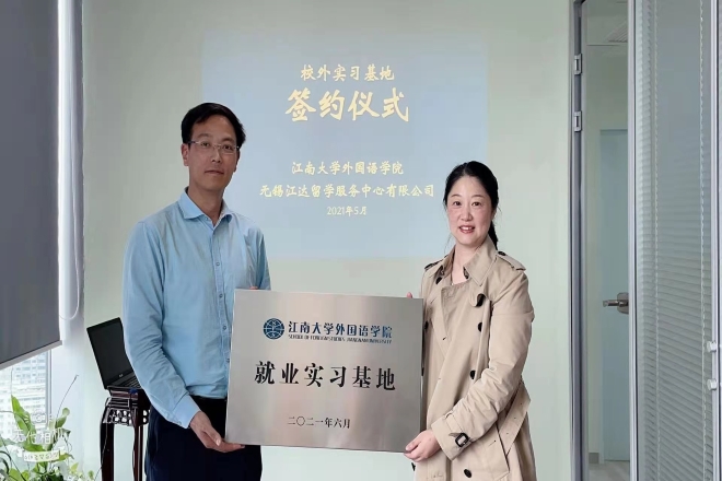与无锡江达留学服务中心有限公司共建就业实习基地签约仪式,学院党委书记史志洪代表学院向江达留学授予“就业实习基地”铜牌。
