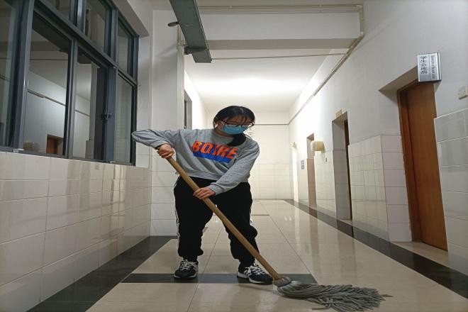 “会议上我们仔细讨论了清洁过程中可能遇到的细节问题,尤其是柳絮这一老大难问题。最后我们决定采取两位同学一前一后的原则:一位同学先用拖把润湿、一位同学后用扫把清洁,这样既方便操作,又保证了清扫的质量。”张龙飞同学在会后如是回忆说。