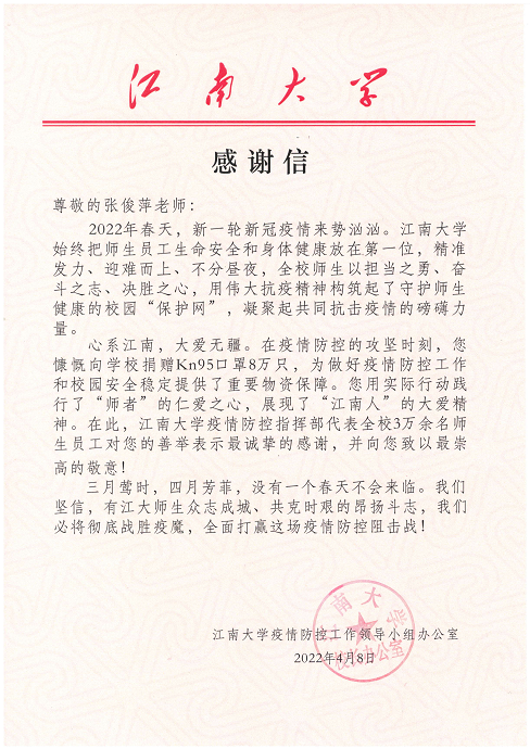 张老师回忆到,上海封城后,无锡防疫形势吃紧,本想着赶紧为封在校内的师生联系一点物资,没想到外地企业4月初已经暂停江浙一带的货运服务。经多方寻找,终于在4月6日联系到承运司机。更没想到的是,无锡高速已经实行严格的交通管制,司机在高速上等候了一天一夜,直到4月7日晚,口罩才得以送到学校,在这特殊时期,所有人共同努力,实属不易!谈到这一善举时,张老师表示,江大是全体师生的家,紧急情况下为“家”着想是很自然的事,而她,只是做了一件每一位党员教师都可能会做的事!