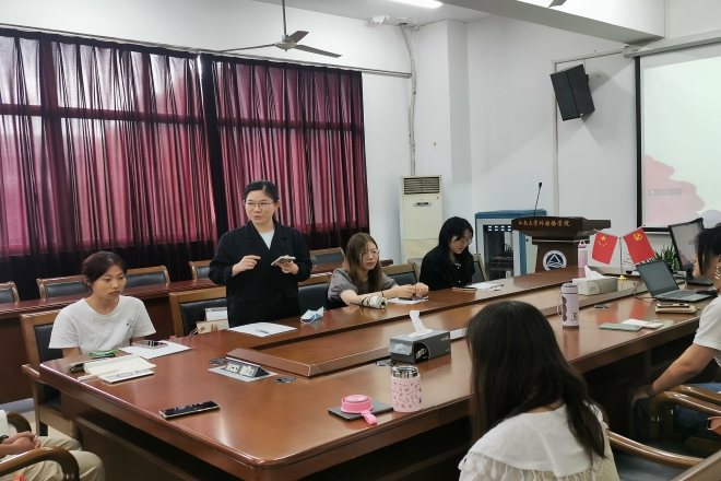 大会第一环节由辅导员陆芳进行新生入学教育。首先,陆老师向同学们介绍了学院负责研究生工作的相关老师,并就“如何度过研究生时光”展开话题,予以建议,如明确毕业目标、做好阶段规划等。其次,陆老师向同学们介绍了学生组织、学校的奖惩、资助政策,鼓励同学们积极参与学科竞赛,丰富课外生活,提高学术能力。最后,陆老师再次强调了请假制度等注意事项,并提醒同学们警惕各类诈骗手段。