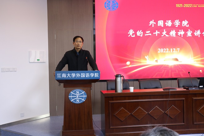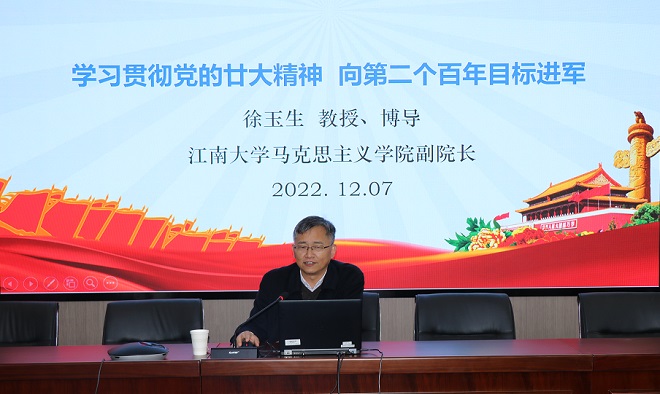 邀请学校学习贯彻党的二十大精神宣讲团成员、马克思主义学院副院长徐玉生教授作题为“学习贯彻党的廿大精神,向第二个百年奋斗目标进军”的专题辅导报告。会议由水果派
