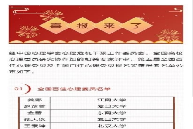 姜娜获评“全国百佳心理委员”