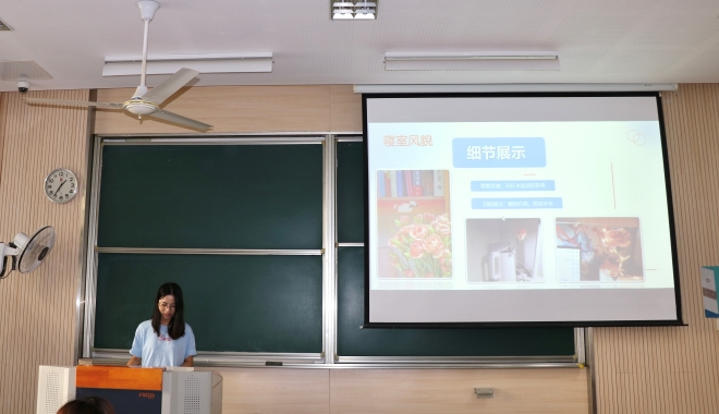 决赛环节,参赛选手们主要讲述自己宿舍的故事、展示宿舍的风采以及舍友之间的温暖情谊。按照抽签的顺序,宿舍依次上台进行展示。每组答辩结束后,可随机抽取生活知识问答的题目进行作答。各个宿舍分别从“个人介绍”“寝室风貌”“宿舍文化建设”“寝室氛围”四个方面进行介绍,给评委和现场观众展示了丰富多彩的图片,生动的文字,精彩的视频……让在场的同学们感受到了各个寝室轻松愉快的氛围。
