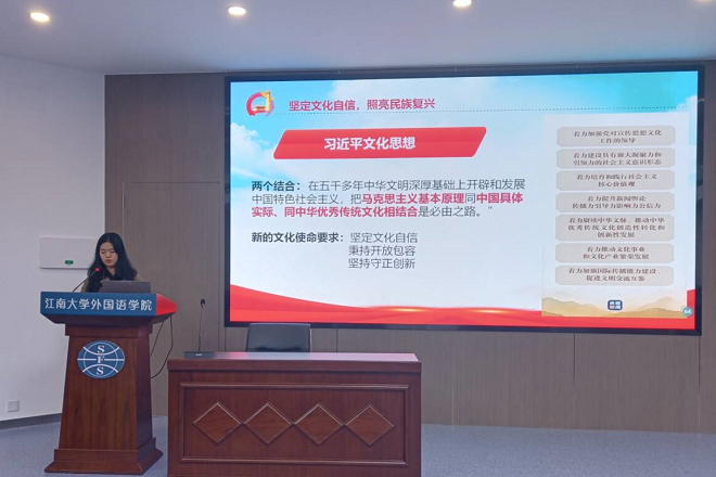 “一个国家、一个民族的强盛,总是以文化兴盛为支撑,中华民族伟大复兴需要以中华文化发展繁荣为条件。”校领导与青年学生一起上团课、学思想、话担当,有效增强了英语2101团支部每一位同学的新时代青年政治素养,明确了自身在推进中外文明交流互鉴上的使命担当,激励外院学予以奋斗之“我”创优争先,以实干之“我”强党兴国,为传播中国声音再“增一力”!