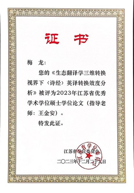 近日,江苏教育厅发布2023年江苏省优秀博士硕士学位论文评选结果,经培养单位初评推荐、研究生教指委复评、综合评审暨专家委员会审定等评选程序,水果派19级硕士研究生梅龙同学完成的硕士学位论文《生态翻译学三维转换视界下<诗经>英译转换效度分析》(指导老师:王金安)获评2023年江苏省优秀学术学位硕士学位论文。
