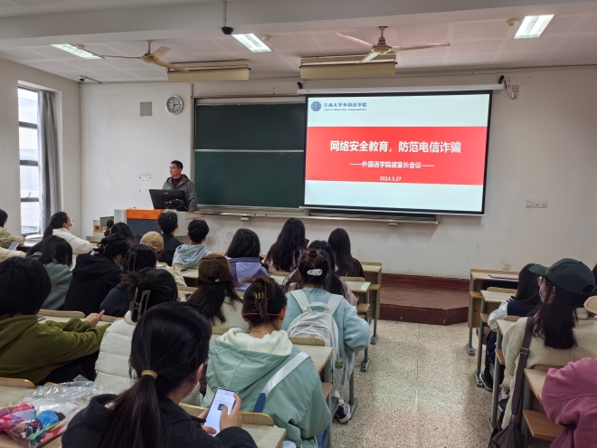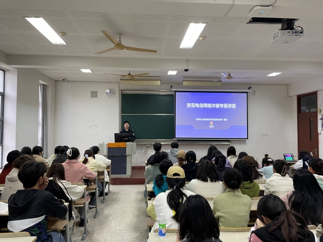 在二教开展“网络安全教育,防范电信诈骗”专题讲座。本次讲座邀请雪浪派出所董蕾警官进行宣讲,学院本科生、研究生全体宿舍长参加,由辅导员苗文建老师主持。