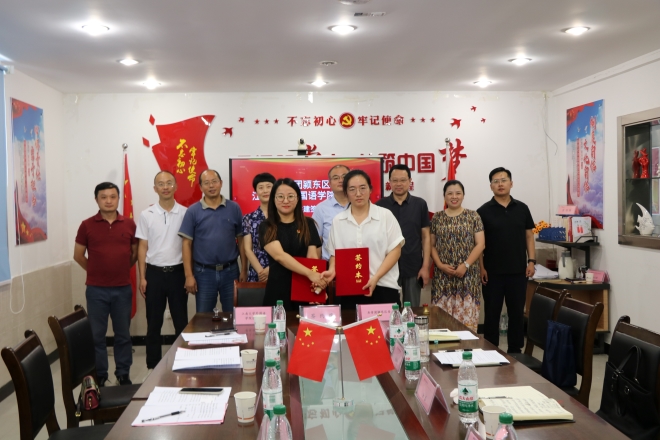 党委书记李荣华,党委副书记、副院长刘伯贤,英语系主任杨勇,院长助理、副教授李文,分团委书记顾海星,辅导员苗文建共同出席此次校地团建结对共建的签约仪式。