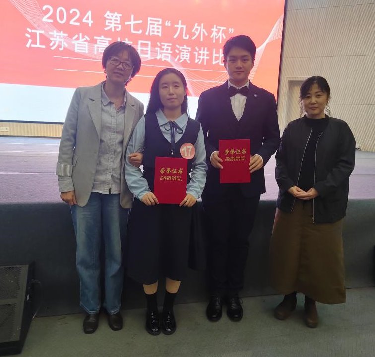 决赛的即兴演讲环节,面对南京大学、东南大学、苏州大学等强劲对手,两名参赛选手稳定发挥,杨炎学同学以内容生动、大方得体,再次以总排名第一的成绩获得一等奖;刘菁同学沉着冷静、语音语调标准获得二等奖。这是继连续两届水果派学生在该赛事上获得最高奖一等奖后,复创佳绩,再续嘉话。此外水果派田村恭平老师、中西由美子老师、吴颖老师荣膺指导教师奖。