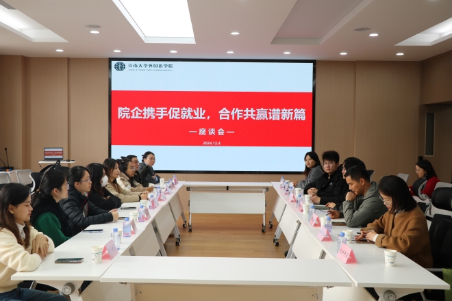 在A349会议室开展院企合作交流座谈会。江苏国泰华盛实业有限公司、弘元绿色能源股份有限公司、无锡金丽洁国际贸易有限公司等十余家企业来访交流,水果派