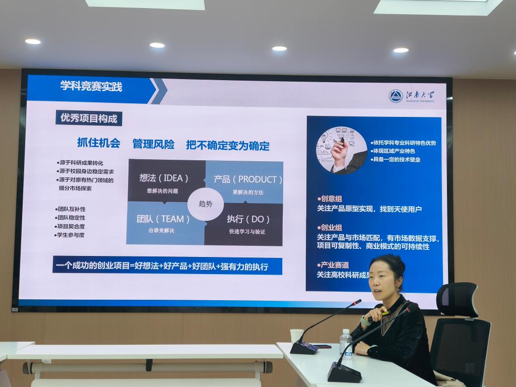 杨宏华老师对中国国际大学生创新创业大赛、“挑战杯”中国大学生创业计划大赛等高级别赛事有非常丰富的指导和评审经验。她详细阐述了如何通过加强学科竞赛赋能人才培养,规范组织管理流程,优化大创项目孵化机制等一系列举措。同时,强调了构建“教育教学、实践实训、指导竞赛、转化孵化”四位一体的创新创业教育实践平台的重要性。
