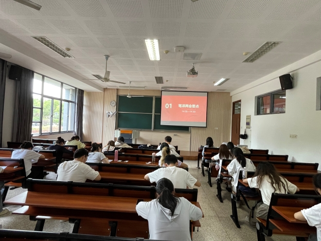 面向全校学生开展"译述两会,语传新声"主题翻译大赛。5月21日下午,翻译大赛决赛在二教2A107举行,学院钱薇薇、王晓静、曹丹、许兰娟担任决赛评委老师。