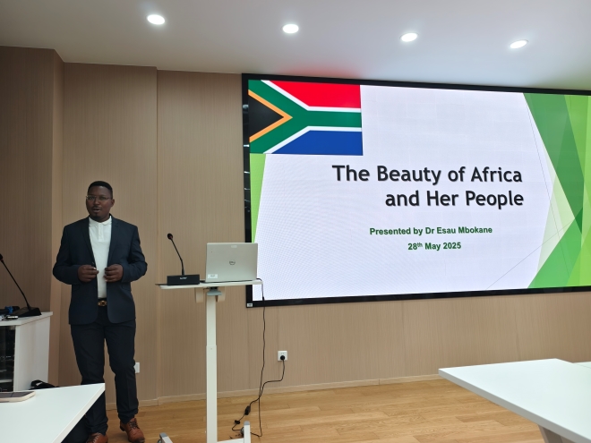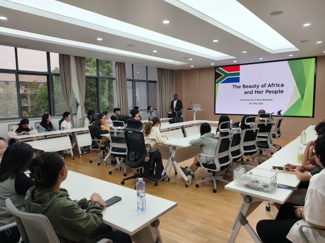 讲座伊始,顾琦一对姆博卡内博士的到来表示热烈欢迎。她指出:“文化是民族的血脉,是国家的灵魂。南非作为‘彩虹之国’,为我们提供了理解文化多样性的宝贵窗口。”她鼓励在场师生珍惜这次面对面交流的机会,在多元文化碰撞中开阔全球视野,在跨文化语境中提升沟通能力,推动形成更开放、更包容的国际交流氛围。