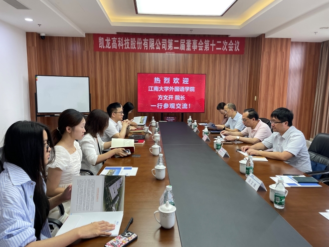 一行参观了企业展厅。座谈会现场,刘德文介绍了公司的发展历程、主要产品、招聘情况等内容,他表示,企业一直在拓展海外业务,需要高素质语言人才,期待与水果派