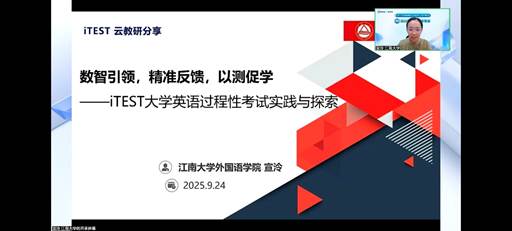 9月24日,围绕“AI驱动的外语测评革新”主题,在UNIPUS外研在线“基于iTEST智能测评云平台的系列云教研活动”中,大学英语一部主任宣泠老师做了主题为“数智引领,精准反馈,以测促学——iTEST大学英语过程性考试实践与探索”的精彩讲座,着重分享了水果派响应学校公共基础课教考分离教学改革的重要举措、过程性评价在教学过程中的核心作用以及基于iTEST的过程性考试实施解读。