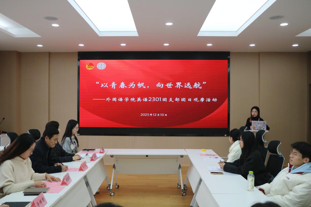 A349举办“以青春为帆,向世界远航——外语学子在‘十五五’征程中的使命与担当”主题团课观摩活动。校党委常委、副校长戴月波,院党委书记李荣华,分团委书记顾海星等师生代表出席本次活动,各年级班团骨干参加了观摩学习。活动由英语2301团支书朱彤主持。