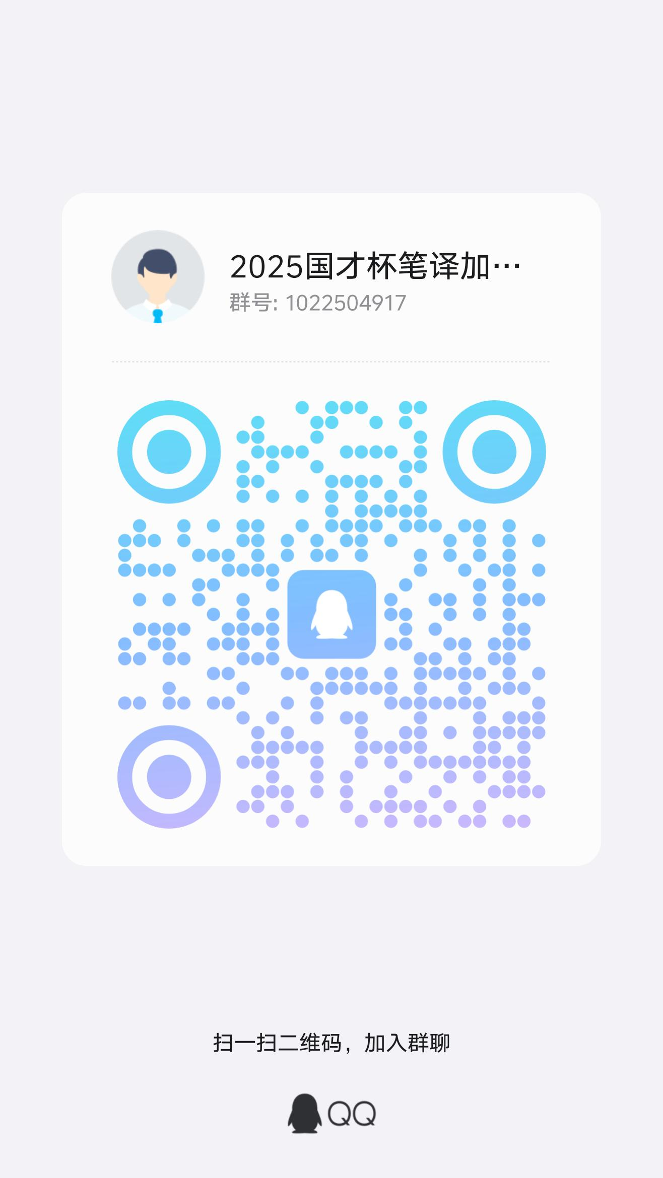 “笔译赛项”参赛注册:登录大赛官网(//ucc.fltrp.com/),参赛选手须在“选手报名/参赛”页面注册报名“笔译赛项”, 流程可参考官网报名指南,//mp.weixin.qq.com/s/TIQ5SyRHBQhykzPi6qVWqA。并且,官网提供备赛资源。报名成功后请立即加入“2025国才杯笔译加油站”(QQ群号1022504917)。
