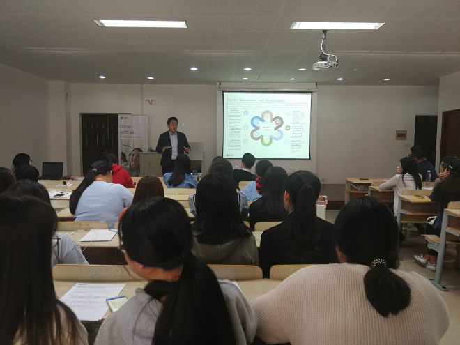 会议在瑞银集团人事主管与同学们亲切的互动中拉开了帷幕。随后瑞银集团各部门负责人做了精彩宣讲。各部门负责人从公司背景、公司文化、公司现状及实习生职业发展、对人才培养等方面作了具体介绍,各有特色。K经理向同学们介绍了瑞银集团发展现状;Y经理介绍了公司的文化及办公环境;J经理则分享了自己七年职业发展经历;C经理更是向大家介绍了瑞银集团员工的各种福利。今年瑞银集团制定了一个学徒计划,第一次面向应届毕业生提供50个实习生岗位,工作地点在上海或是无锡。瑞银集团强调团队合作,注重对新员工的培养,鼓励新员工不断突破自我。宣讲会的最后参会学生与宣讲嘉宾进行互动问答,现场氛围热烈而持久。